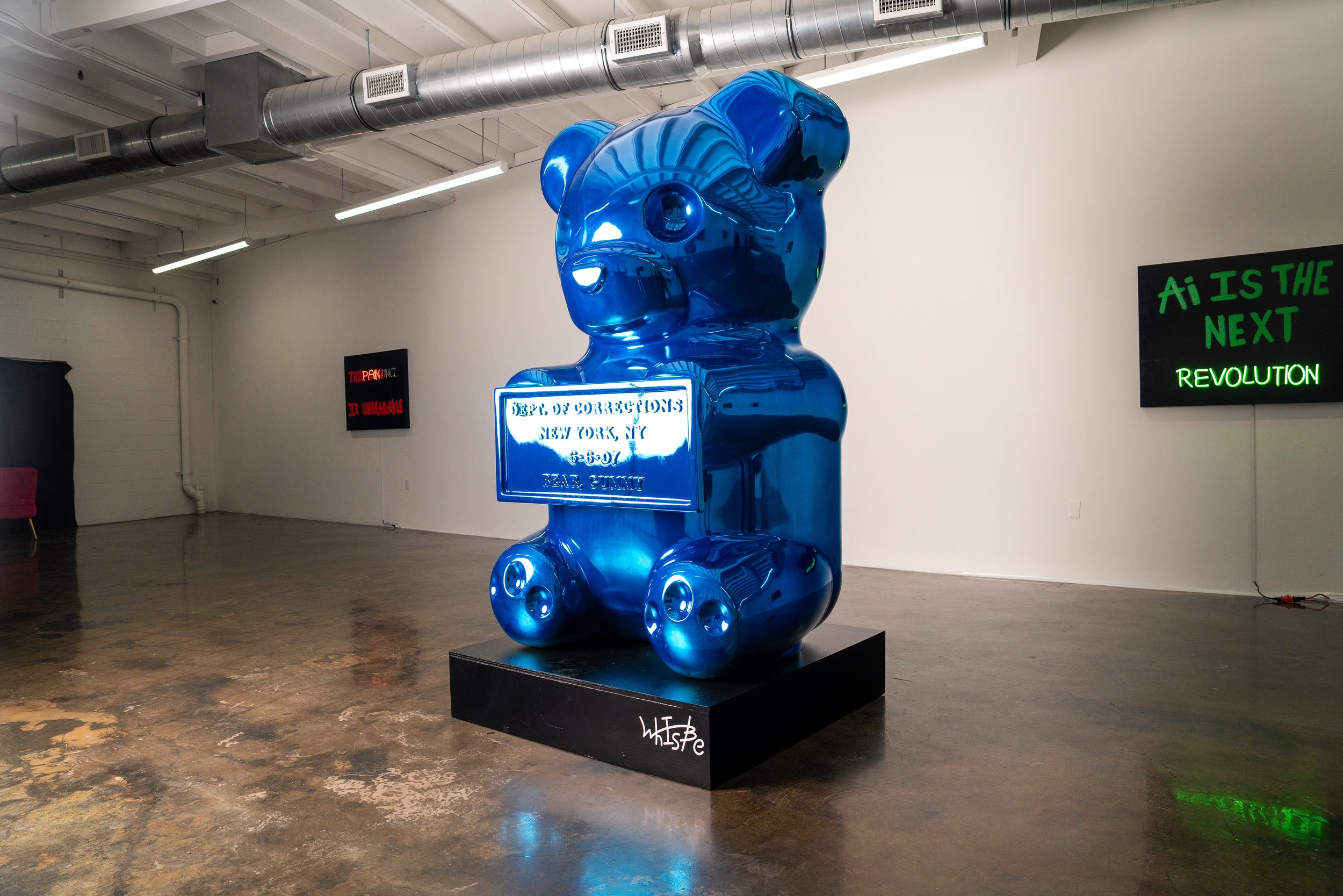 Whisbe's work first appeared on the streets of Brooklyn in 2013 with the iconic "Vandal Gummy" garnering the attention of the art world and fashion world. 10 yrs later monumental sculptures of the Vandal Gummy can be seen in museums and public spaces globally, the largest to date, a 27ft tall behemoth in the Hong Kong harbor, and Whisbe has collaborated with numerous fashion brands, such as Coach and Playboy. WhIsBe has also taken the NFT/digital art space by storm with multiple seven-figure sales, as well as sales at Sotheby's and Christie's.